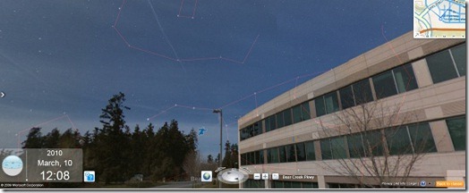 Now you can try it for yourself in the new version of Bing Maps. Towards the bottom of the page there's a button called "Map Apps" and clicking on it shows you a list of apps you can enable. If you turn on Worldwide Telescope, then go to streetview somewhere (it's somewhat limited on where you can do this), you can then drag the sky into view and the image will dim and reveal what constellations you can see at the present time. I can't wait to try it at night and see how well it works.