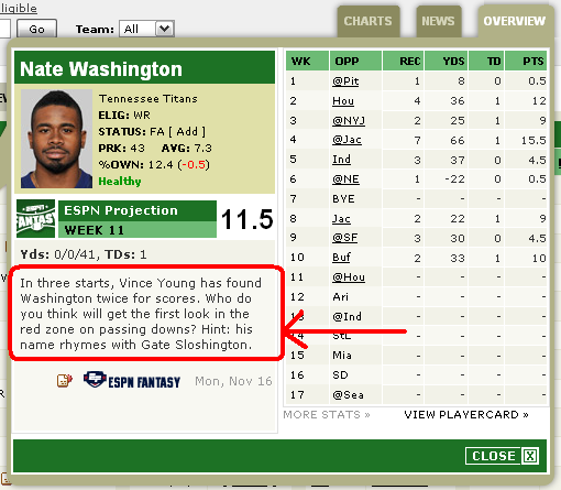 Whoever writes the player descriptions for ESPN's Fantasy Football is hilarious. The descriptions are always amusing. In particular, this one cracked me up: