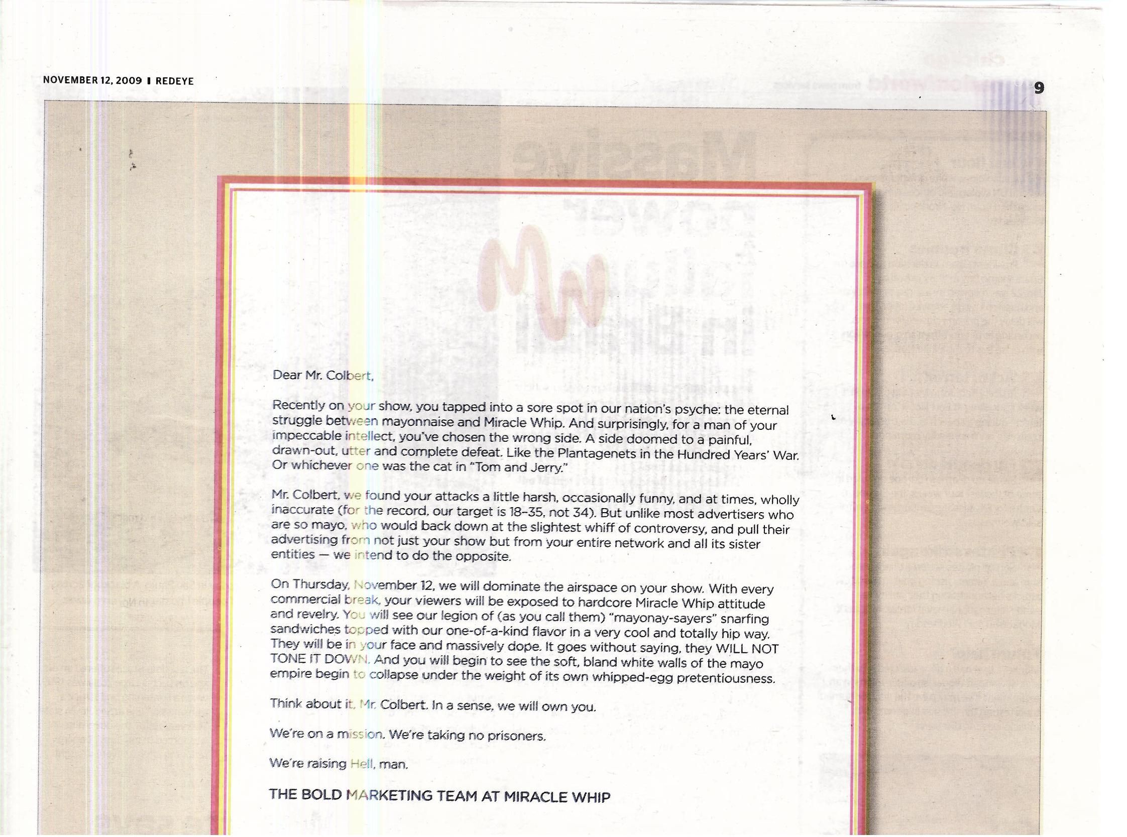 dave submitted a fantastic link about the war between The Colbert Report and Miracle Whip. It started when Miracle Whip aired a new ad campaign trying to make Miracle Whip look cool and edgy, with the taglines like "we will not tone it down" and "don't be so mayo", and Colbert responded with a parody of the commercial that advertised generic mayonaisse: