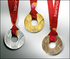 The medals have the Turin logo on one side and images from various sports and disciplines on the other. The red silk ribbon that goes around the winner's neck is looped through the hole in the center.