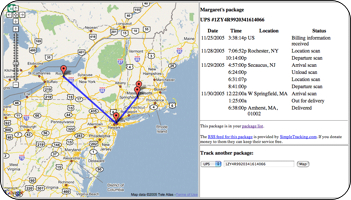 Update: The page has been forced to stop providing UPS tracking as the service they were using no longer offers that and UPS is not being very cooperative. As mentioned on the page: "This site was inspired by SimpleTracker.com, and originally used their RSS feeds. These feeds no longer contain enough information to make a map. The other possible source for UPS tracking information is UPS itself. UPS informed me on January 18 that 'UPS has reviewed your application and has made a decision not to authorize you at this time.' If anyone knows anyone at UPS and cares to lobby on my behalf, I'll add UPS back when I'm authorized to."