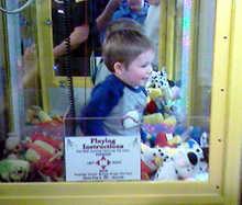 The tot crawled through the toy discharge chute in the Toy Chest claw machine at a Godfather's Pizza in Austin and got stuck amid all the toys.