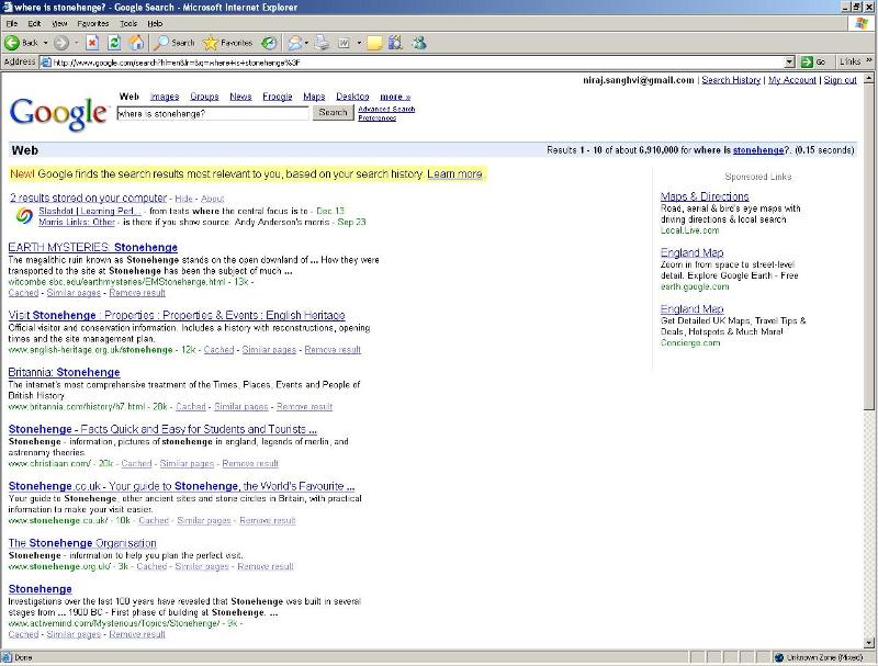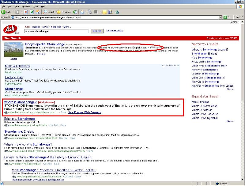 To test the ability to answer questions, I started simple. I asked "where is stonehenge?" Surprisingly, Ask gave me two well highlighted answers (one was even marked "Web Answer"), while Google performed poorly. The first Google result actually contained the answer, however the excerpt on the results page read "The megalithic ruin known as Stonehenge stands on the open downland of..." It cut off the answer! Also, somehow the question did not trigger Google's Onebox.