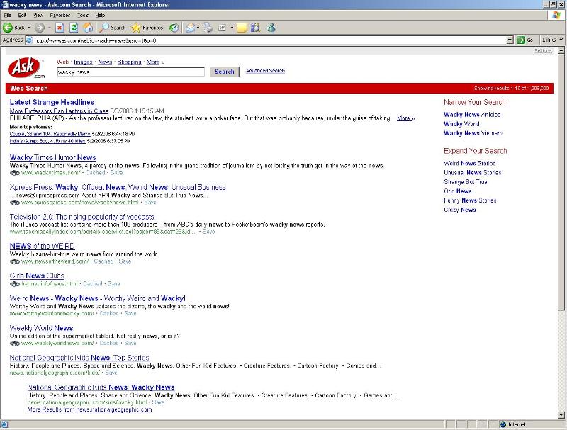 To further test, I searched for "wacky news" to see how Ask might differ. It was apparent from the top right of the search results page that they were not just looking for wacky, but also "strange," "unusual," "odd," "funny," and "crazy" news stories (seen in the "expand your search" section in the screenshot). On the other hand, if Google results returned any pages with these terms, it was only coincidental as the page had to contain the term wacky. On Ask, several pages did not contain the word wacky at all, indicating it had searched on related terms as well: