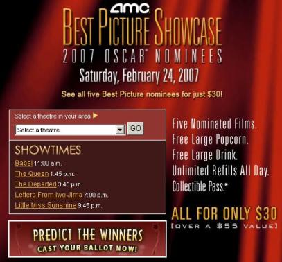 this sweet deal: $30 gets you the 5 Best Picture nominees, and unlimited popcorn and pop. That's 11 hours of movies!