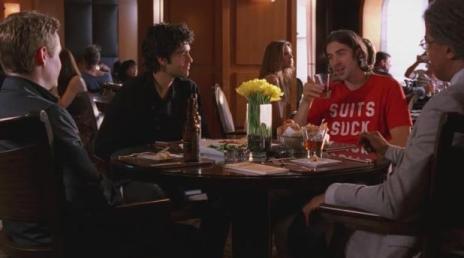 Billy wears his "Suits Suck" shirt at an opportune moment.