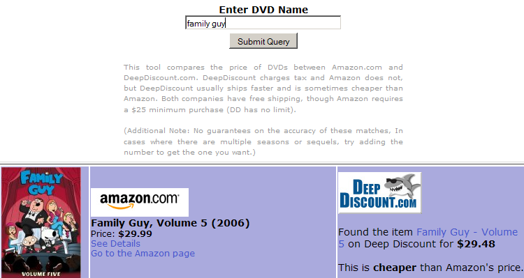 So I decided to update it, mostly because Amazon now has an API and I wanted to play with that. So now you can go to the DVD price comparison tool page, enter a DVD name (TV shows on DVD work too...include a number to find a particular season/volume). In the results you will get the top Amazon.com matches, and I compare the top match from that to the top match from Deep Discount.