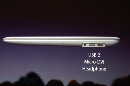 The 0.16-inch thin MacBook Air -- a laptop so thin it fits in a manila envelope. The new machine features a full-size keyboard and LED-backlit 13.3-inch display with built-in iSight, and the new larger trackpad supports multi-touch gestures. Just like the iPhone, you'll be able to pan around, pinch to zoom, and rotate with two fingers, and move windows with a flick. Apple got the size down by using the same 1.8-inch 80GB drive that's in the iPod classic, but you'll be able to order a 64GB SSD instead. The Air eschews optical media, but there's a separate external you can snag for $99 and Apple's also announced a feature called Remote Disk that'll let the Air get data off the optical drive in any PC or Mac running the Remote Disk software. Pricing starts at $1799, and the Air will be shipping in two weeks.