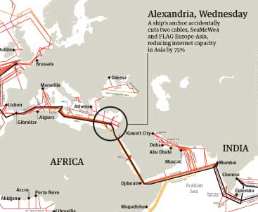 A ship forced to drop anchor off the coast of Egypt because of bad weather ended up accidentally cutting two undersea cables that provide internet capacity for 75% of Asia. The accident is proving troublesome because it takes a while to send repair ships to the site and make the repair, and the resulting crippled internet is causing trouble for businesses, particularly outsourcing companies that rely on the internet for business. The internet's routers will gradually find new routes using other cables (i.e. from the east instead of the west of Asia) but this takes time and the resulting speed can be significantly slower.