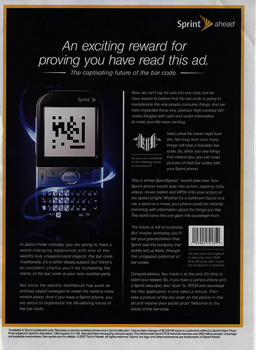 The ad led Sprint users to text "scan" to 70734 to get a program called Scanlife that allows such interaction. The ad also contained a barcode which led to a page with some free ringtones. Some phones require you to take a picture of the barcode, which then gets interpreted. Other phones let you simply move the camera over the barcode and as soon as it is recognized (in real-time), the phone beeps and takes the appropriate action.