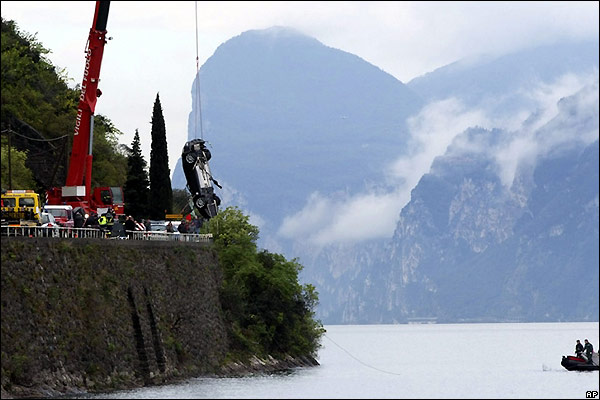 Italian TV showed the car, reportedly the only one available for use in the film, being winched out of the lake.