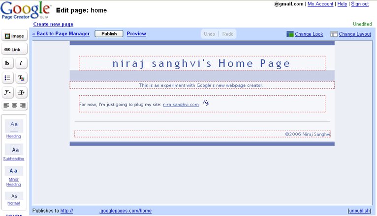 You login with your Google Account (required) and that becomes your URL. This is not a very good idea since by revealing my URL, I am also revealing my email address, though only indirectly. If your email address is in the form firstname.lastname@gmail.com, your webpage would be at http://firstname.lastname.googlepages.com. However, as with gmail, you can add and remove dots from your username, so the URL http://firstnamelastname.googlepages.com would work as well.