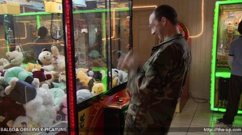 The tot crawled through the toy discharge chute in the Toy Chest claw machine at a Godfather's Pizza in Austin and got stuck amid all the toys.