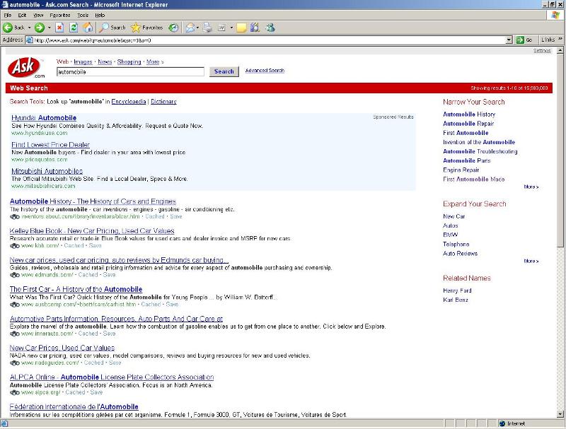 First I decided to check this new concept-understanding. I ran a search for "automobile." As you would expect, Google and Ask yielded fairly similar results. But Kelley Blue Book, an excellent resource for car buying, appeared as the second result on Ask, while it did not even appear on Google's first page of results, probably because it does not contain the term "automobile" but rather "car.":