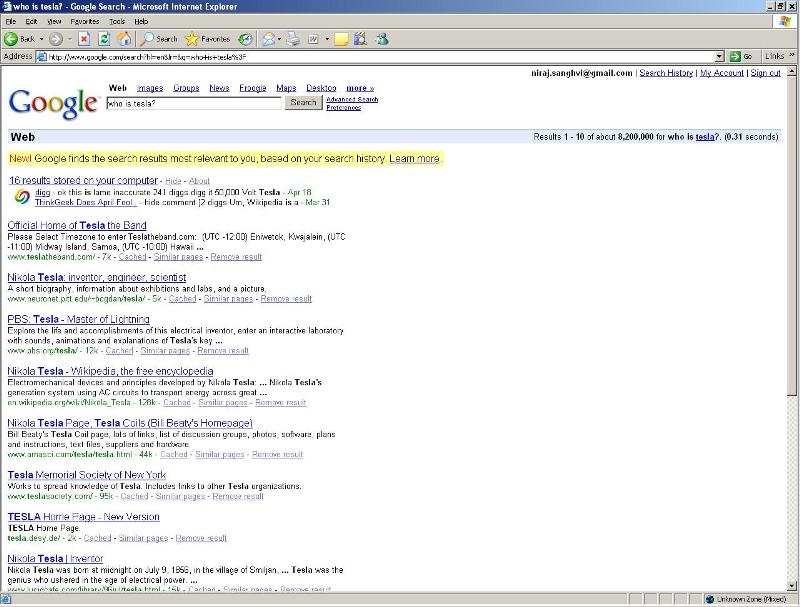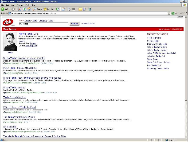 As a final test, I decided to ask "who is tesla?" to see how well the search engines could find an answer. My expectation was both would return biographical excerpts about Nikola Tesla. Google's first result was for the homepage of Tesla, the rock band :) Ask on the other hand, had a picture of Nikola and a biography as an answer, and the first result also was a webpage about him.:
