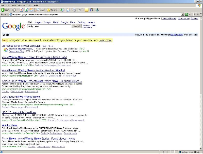 To further test, I searched for "wacky news" to see how Ask might differ. It was apparent from the top right of the search results page that they were not just looking for wacky, but also "strange," "unusual," "odd," "funny," and "crazy" news stories (seen in the "expand your search" section in the screenshot). On the other hand, if Google results returned any pages with these terms, it was only coincidental as the page had to contain the term wacky. On Ask, several pages did not contain the word wacky at all, indicating it had searched on related terms as well: