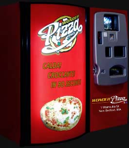 A 9" pizza in just 2 minutes from a vending machine?!? This is crazy. I can't even microwave a pizza in that much time, so I'm guessing the vending machine houses about 5 Oompa-loompas with some heavy duty blowtorches.