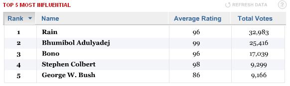 TIME Magazine is having people vote on who the 100 most influential people are today. The list spans politics, media, etc. There's been a lot of fluctuation as a result of user votes from different large websites. Currently, Stephen Colbert appears in 4th place on the list, next to Bono and just above George W. Bush with nearly 9,300 votes: