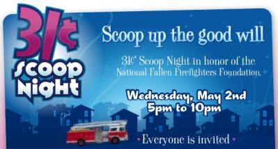 31 cent scoop night this Wednesday night from 5pm to 10pm! It's not free, but the $0.31 goes towards the National Fallen Firefighters Foundation.