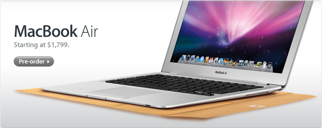The 0.16-inch thin MacBook Air -- a laptop so thin it fits in a manila envelope. The new machine features a full-size keyboard and LED-backlit 13.3-inch display with built-in iSight, and the new larger trackpad supports multi-touch gestures. Just like the iPhone, you'll be able to pan around, pinch to zoom, and rotate with two fingers, and move windows with a flick. Apple got the size down by using the same 1.8-inch 80GB drive that's in the iPod classic, but you'll be able to order a 64GB SSD instead. The Air eschews optical media, but there's a separate external you can snag for $99 and Apple's also announced a feature called Remote Disk that'll let the Air get data off the optical drive in any PC or Mac running the Remote Disk software. Pricing starts at $1799, and the Air will be shipping in two weeks.