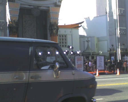 Yeah, I just got back from a week in L.A. and I totally had a brush with fame. By which I mean I saw the setup for the movie premiere of Forgetting Sarah Marshall at the Chinese Theatre in Hollywood, but was there way too early to see any of the celebrities that showed up later (I was on a tour so I couldn't exactly stick around for hours). And to top it off, I had forgotten to bring my digital camera along, so I have some cool pics but they're on a disposable camera which I need to get developed. In the meantime, since I know you're chomping at the bit, here's a much crappier pic I took on my cellphone. I didn't even bother to re-take it with the van in the way since I was more concerned about the disposable.