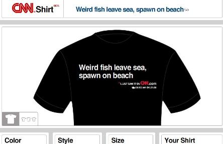 Clicking on the link takes you to a page where you can buy a shirt with the headline on it that also says "I just saw it on CNN.com" and lists the date and time. The service is in beta, and shirts are $15 plus $5 shipping. They let you get the headline on a gray, black, or white shirt, and the sale takes place through spreadshirt.com.