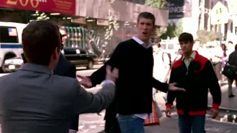 It was pretty ridiculous how they got treated like kids by their parents even though they had only been home for a few days. At any rate, it seemed like Vince's mom's prying spurred some looking into getting Vince a role in a Gus Van Sant movie, so E called up Ari, only to find Gus didn't want Vince for the part. Ari and Vince were inclined to give up, but E pushed to talk to or meet with Gus to get him to at least audition Vince. He actually did manage to meet Gus after waiting in his office for 6 hours, and Gus indicated he was quite familiar with Vince's work. Nonetheless, E managed to convince him to look at Vince's acting in Smokejumpers, since it is supposedly Vince's best acting, and Gus relented. Right after that there was a quick, random Michael Phelps cameo...E ran into him (literally) on the street while talking to Ari on the phone (pic). Later on Gus called Vince and told him he really liked it and he wanted to work with Vince, but it would be on a future movie.